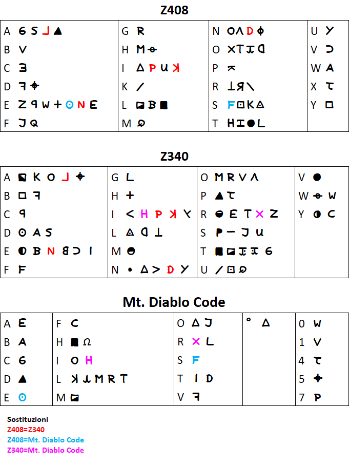 Il codice โMt. Diabloโ รจ composto da 32 caratteri. Soltanto tre vengono ripetuti (una sola volta). Significa che ci sono 29 simboli differenti.