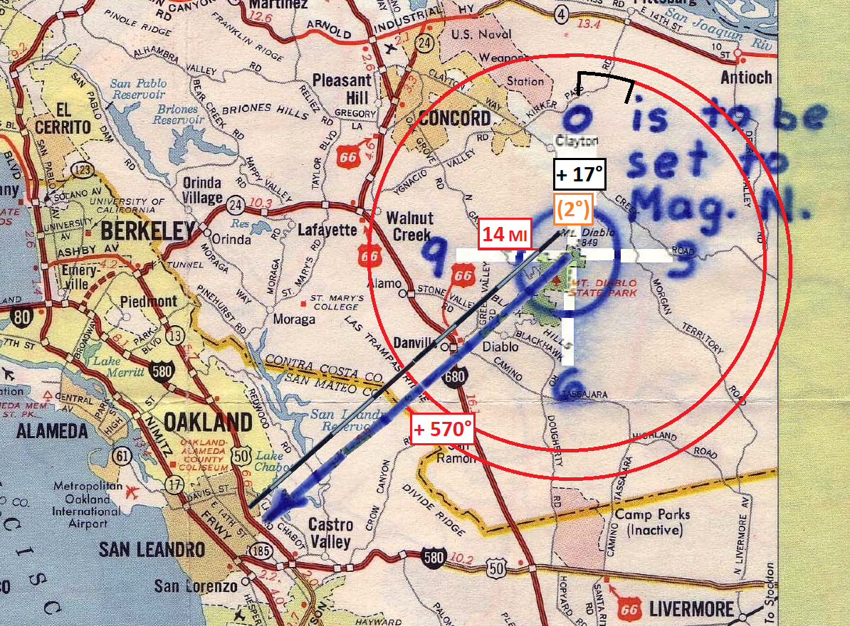 ร la rotta da seguire dalla cima del Mt. Diablo all’obiettivo (stando alla mappa usata da Zodiac), che si trova nella cittadina di San Leandro. Per determinarla, l’autore del testo cifrato si รจ servito del metodo classico per orientarsi con bussola e mappa.