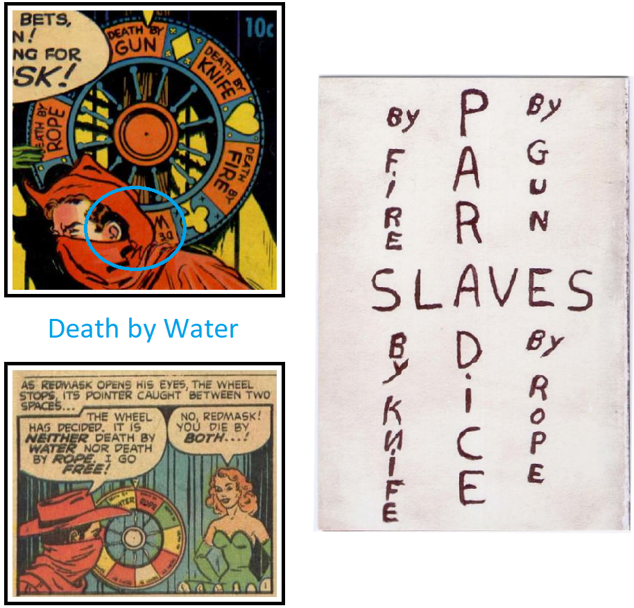 The only death the killer did not copy and paste from the cover of Tim Holt #30, is just: “By water” (it’s one of the deaths to which Redmask is condemned – you can read it here on page 8 of the comic).
