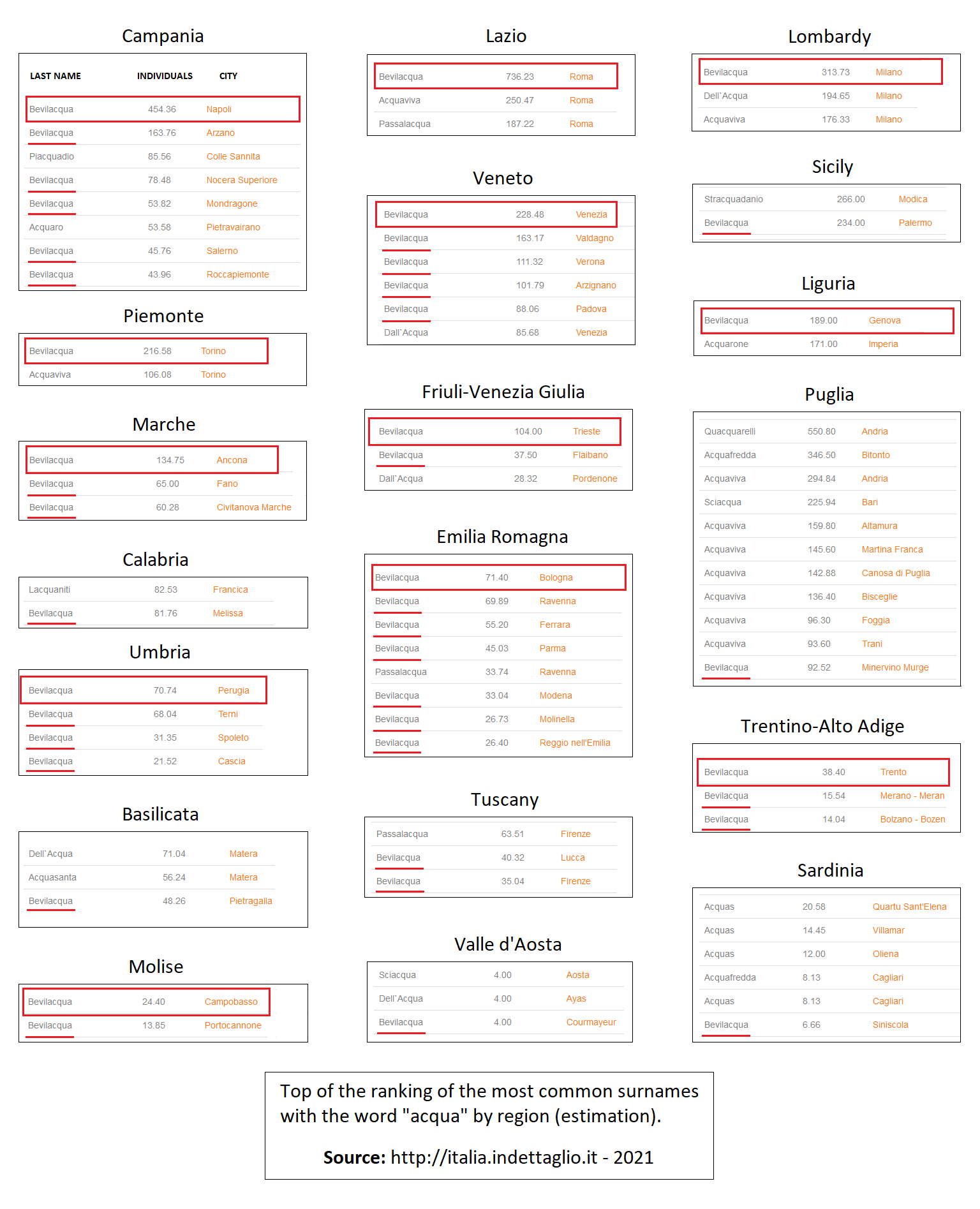 In Italy, the most popular surname with the word “acqua” in 13 on 20 region capitals (estimate) is “Bevilacqua”, drink-the-water (here the first results for each Region – source).