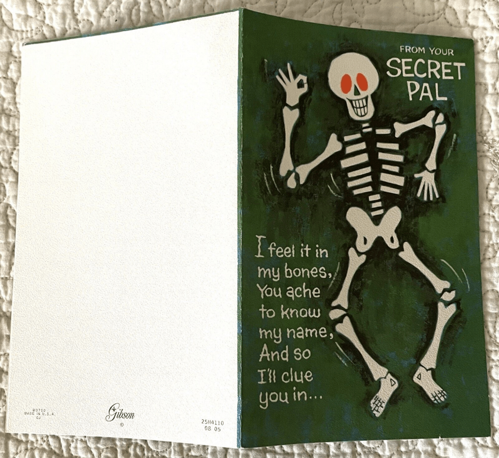 The Halloween card is pre-printed but Zodiac makes various changes before sending it to Paul Avery, adding writings, drawings, cutouts of a pumpkin, of a skeleton.