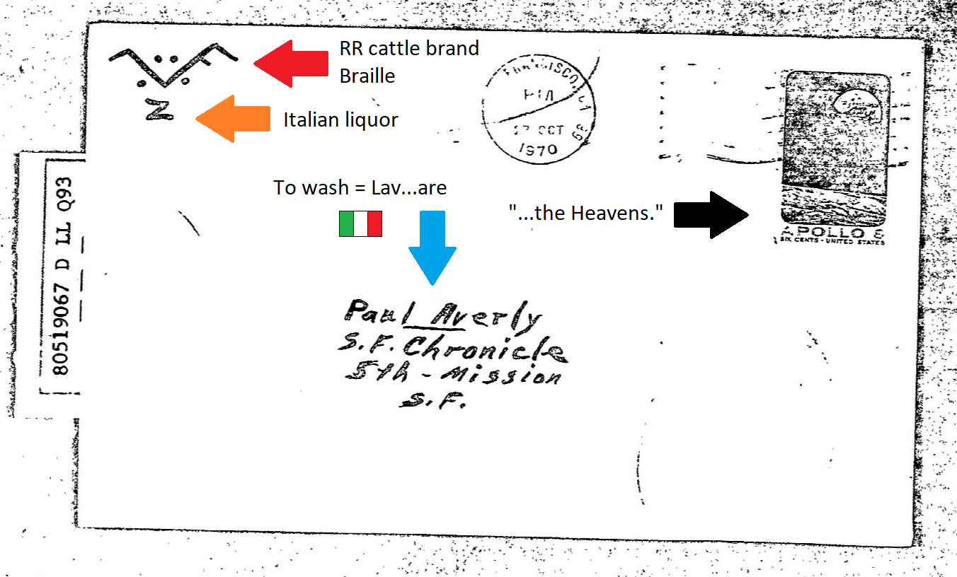 On October 27, 1970, Zodiac mails a modified Halloween postcard to San Francisco Chronicle reporter Paul Avery (misspelled “Averly” on the envelope).