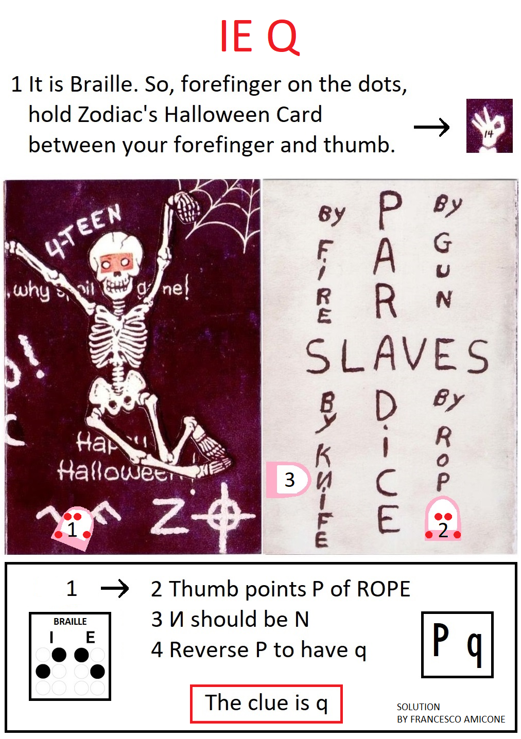 The main solution to the Zodiac’s Halloween riddle is reached through assonance between the letter Q and the syllables of the word CUCÙ derived from “The cuckoo’s game ”, Il gioco del cucù, the Italian version of Peek-a-boo. CUCÙ has the same pronunciation of QQ in Italian and is the correct translation of BOO from English to Italian in this case.