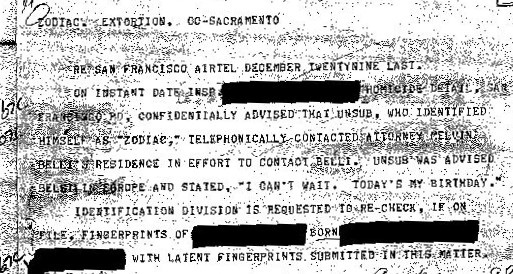 Il 29 dicembre 1969, la polizia di San Francisco tramite l’ufficio dell’FBI locale invia una lista di venti sospettati al Bureau (qui il telegramma) per un controllo sul caso Zodiac.