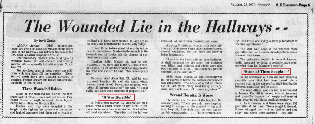 - David Zenian (UPI), “The wounded lie in the hallways”, San Francisco Examiner, 25 settembre 1970, p. 5. โฉ๏ธ