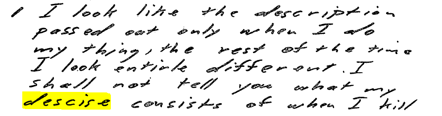 "Mi piace uccidere la gente perchรฉ รจ molto divertente / รจ piรน divertente che uccidere la selvaggina nella foresta / perchรฉ lโuomo รจ lโanimale piรน pericoloso di tutti / uccidere mi dร lโesperienza piรน eccitante / รจ anche meglio di scopare con una ragazza / la parte migliore รจ che quando morirรฒ rinascerรฒ in paradiso / e tutti quelli che ho ucciso diventerranno miei schiavi / non vi darรฒ il mio nome perchรฉ cerchereste di rallentare o fermare la mia collezione di schiavi per il mio aldilร / ebeorietemethhpiti"