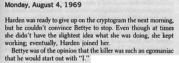Va ricordato, infine, che “io” รจ l’incipit del primo testo cifrato di Zodiac,99 la prima parola a essere decrittata grazie a un’intuizione di Bettye Harden, moglie di Donald, raccontata da Graysmith in “Zodiac”:100