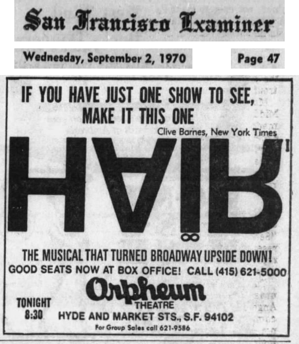 - Hair, poster, A.C.T.โs Geary Theatre, San Francisco, 1969/1970. Per le pubblicitร vedere le note 15 e 16. โฉ๏ธ