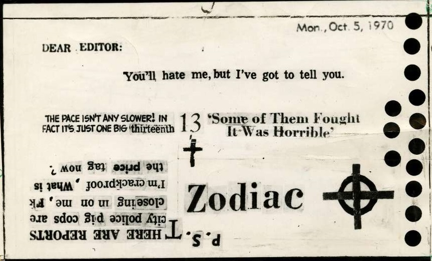 Fra il ’69 e il ’74, Zodiac spedisce una ventina di lettere alla stampa nell’area di San Francisco, la maggior parte al Chronicle. Alcune di esse includono testi cifrati e indovinelli.