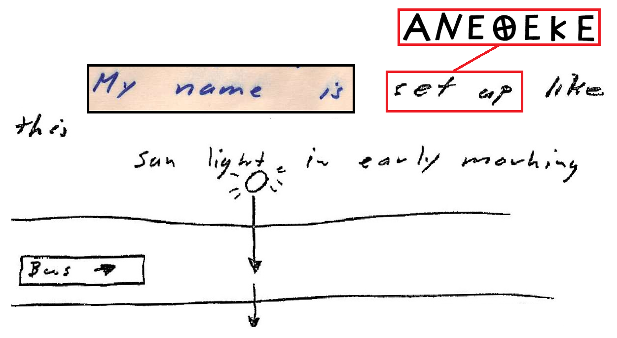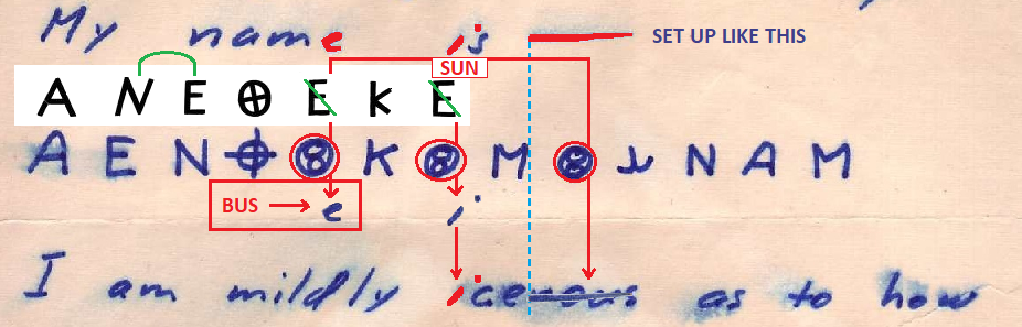 - La prima parte del testo cifrato รจ chiaramente ricopiata da un’iscrizione in greco antico, leggermente modificata (capitolo 4). Questa scoperta, divulgata per la prima volta dal sito zodiackiller.com, pone in forte dubbio che si tratti di un testo cifrato a sostituzione.
