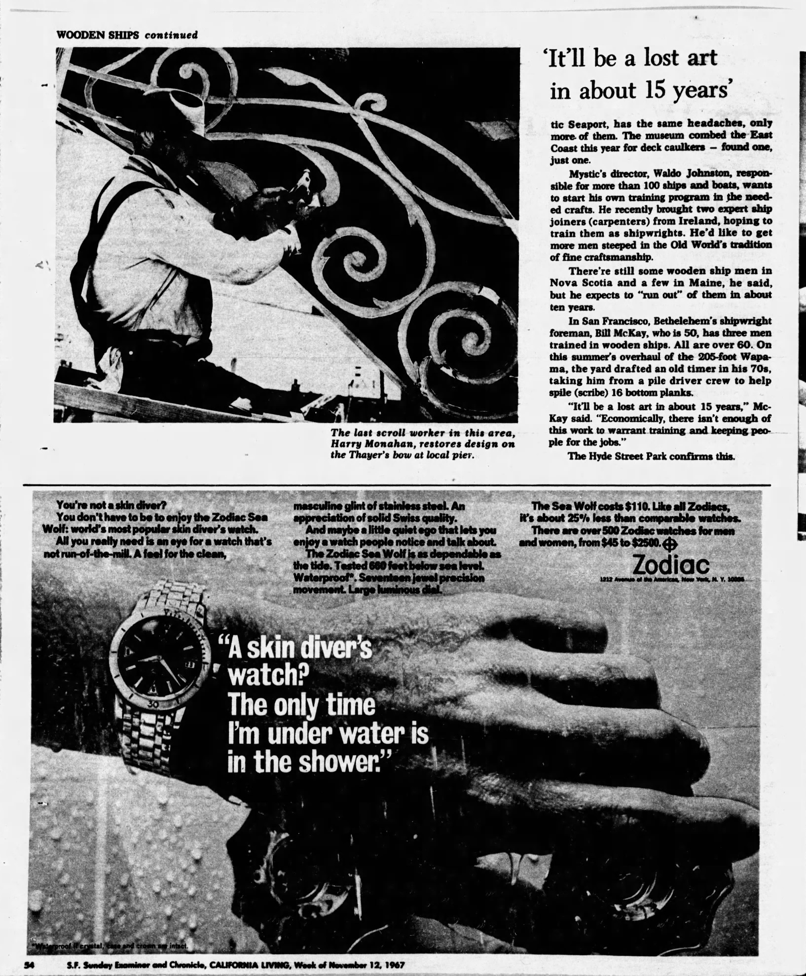 - Sunday S.F. Examiner and Chronicle, California Living, settimana del 12 novembre 1967, p. 54. Varie inserzioni sullo Zodiac Sea Wolf come questa vengono pubblicate sui giornali statunitensi nel 1967. โฉ๏ธ