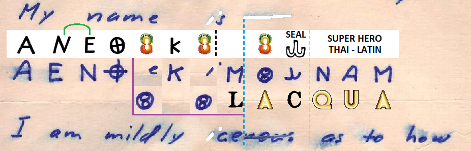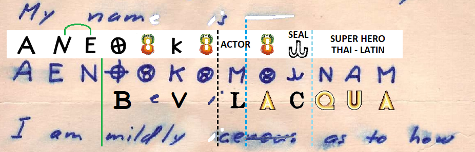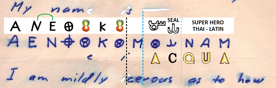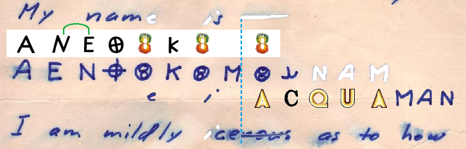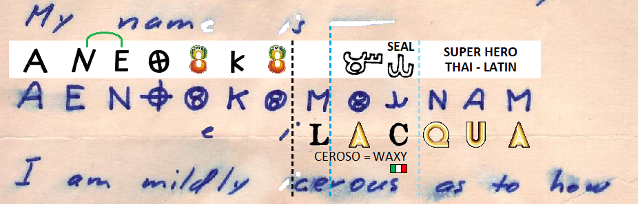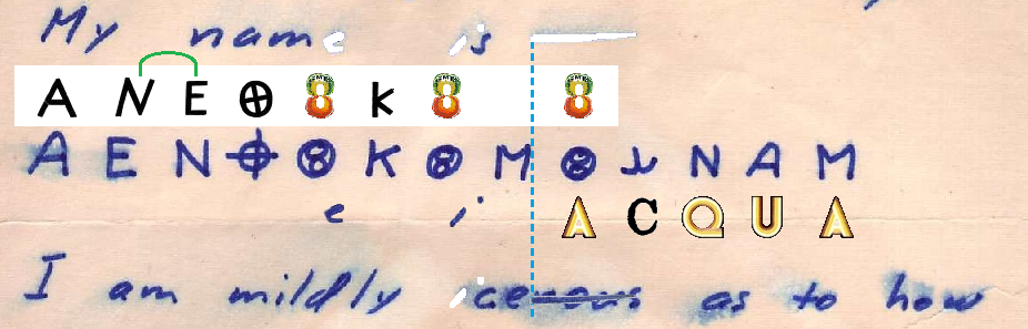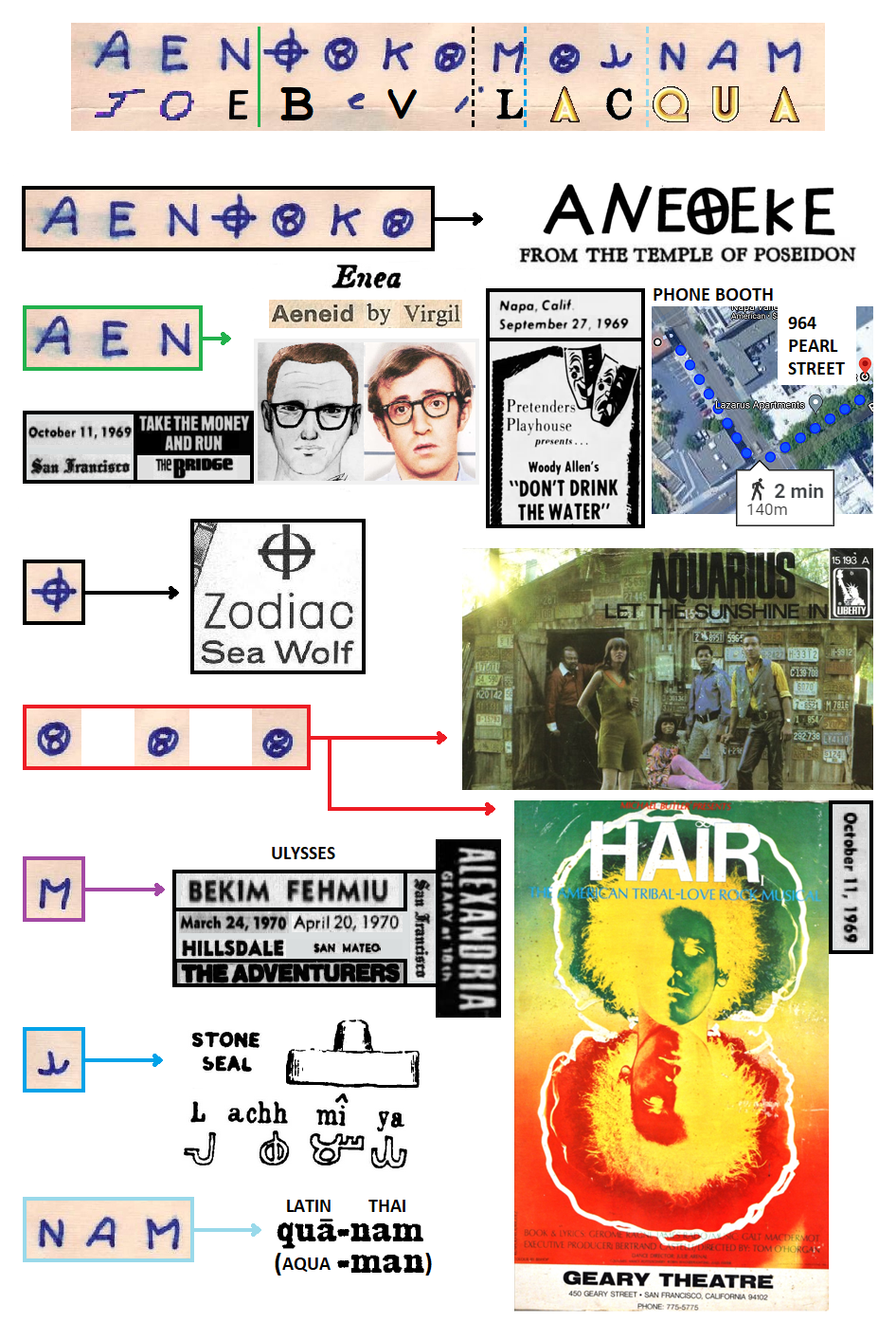 La prima parte del codice di Zodiac non richiama genericamente la parola “anetheke”, ma una specifica iscrizione con una “theta” arcaica a forma di croce celtica che si puรฒ trovare in un tempio di Poseidone (dio del mare) a Capo Tenaro, in Laconia, ed รจ stata riprodotta nel libro “The Alphabet” del designer tipografico Frederic W. Goudy.