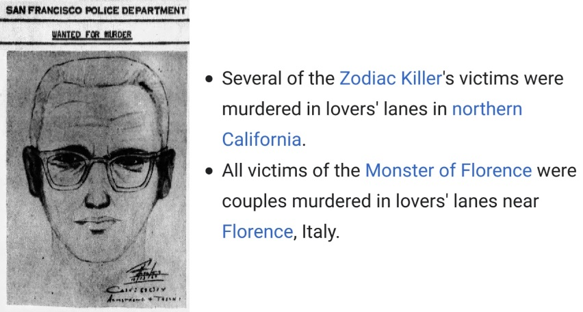 It is no coincidence that the Monster of Florence and the Zodiac are placed next to each other on the English Wikipedia page dedicated to “Lovers’ lane”.