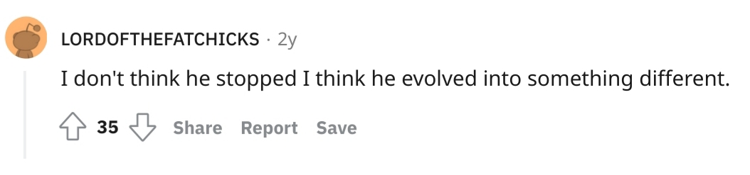 The most popular theory on Reddit is that he has never stopped. That he has become “something different”. What?