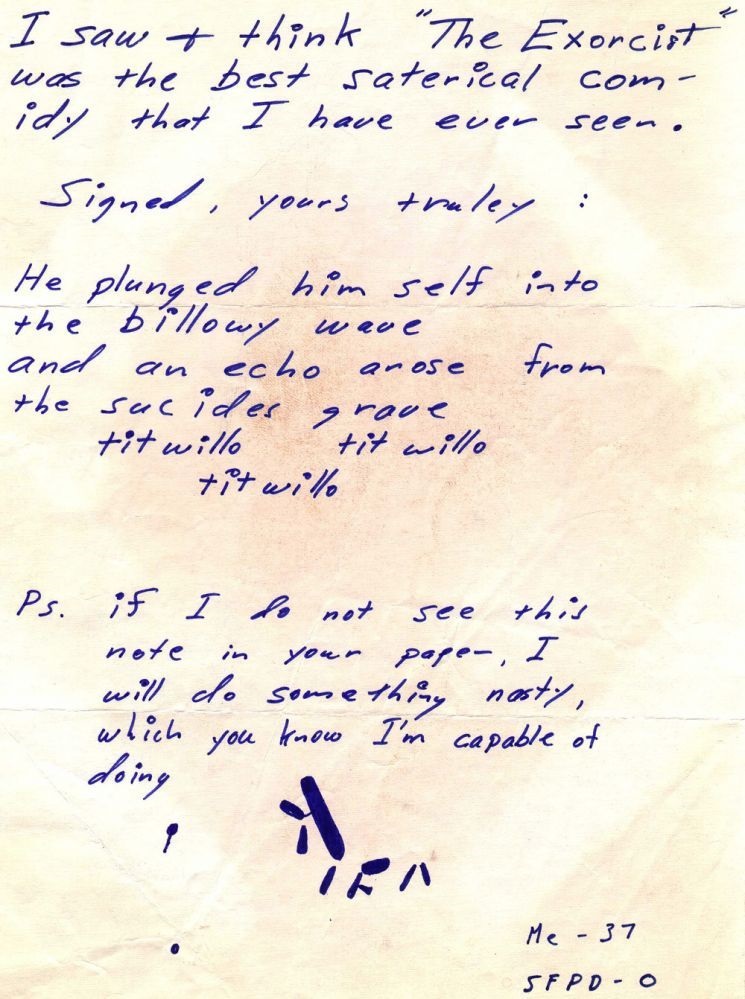 In his last message of January 29, 1974, the American serial killer quotes “The Exorcist” by defining it “the best saterical comidy I have ever seen”.