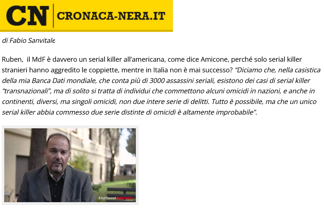 During the media coverage following the publication of my 2018-articles on the Monster-Zodiac connection and on the admission of “Ulysses”, two renowned Italian criminologists, Ruben De Luca and Roberta Bruzzone, expresse themselves critically on cronaca-nera.it and in the weekly Di più.