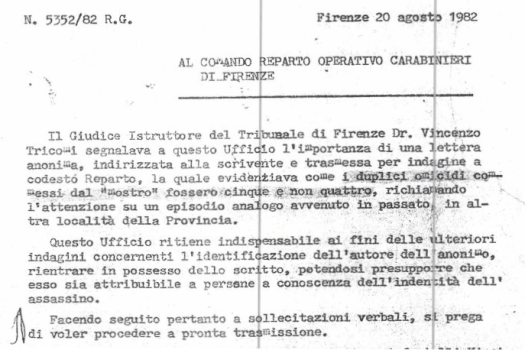 Ciรฒ che รจ probabile รจ che il 20 luglio 1982, quando viene pubblicato su La Nazione l’appello del comando dei carabinieri al “cittadino amico”, i carabinieri abbiano giร visionato la copia della relazione balistica del ’68 conservata per legge dal perito. Sanno giร che ci sono alcune corrispondenze fra i reperti di Signa e del caso Mostro, anche se non hanno ancora la certezza di un collegamento. Sicuramente hanno anche avvisato il giudice Tricomi.