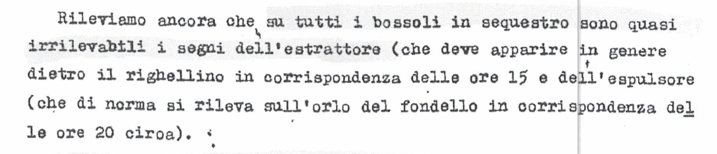 E’ un modo per dire “non sono riuscito a trovarli”, lo dimostra il fatto che il perito non riesca a individuare con certezza il tipo d’arma (nella Beretta del Mostro erano cosรฌ marcati da renderla facilmente identificabile) e che non citi la presenza di queste tracce quando esclude che si tratti di un revolver (sprovvisto di espulsore ed estrattore, come osserverร qualche anno dopo).