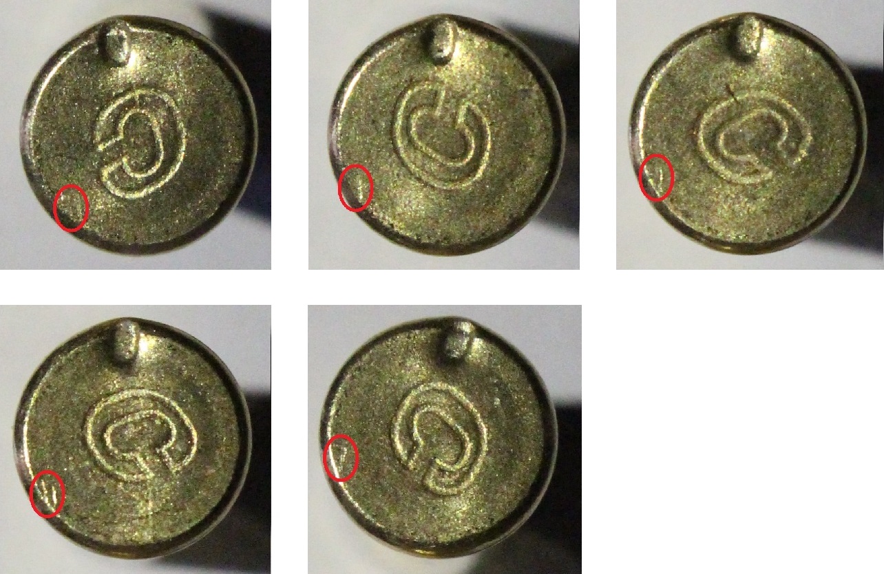 Riepilogando: due con la punta schiacciata (A e B), uno con la punta quasi integra (C), un frammento (D) e uno con la punta schiacciata sul lato (E).