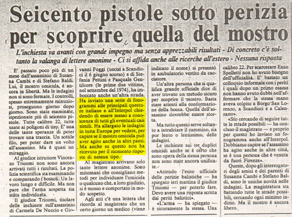 - Mario Spezi, “L’indagine fu riaperta quasi per caso”, La Nazione, 27 gennaio 1984, p. 2.Mario Spezi, “L’indagine fu riaperta quasi per caso”, La Nazione, 27 gennaio 1984, p. 2. โฉ๏ธ