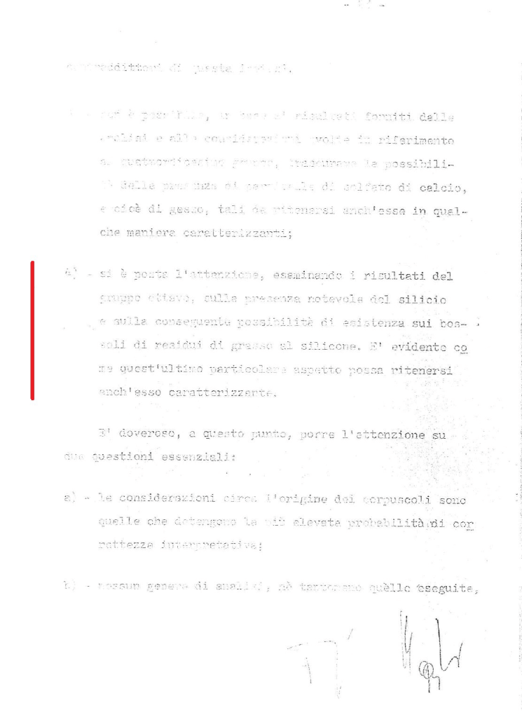 Con la successiva perizia Iadevito-D’Uffizi-Crea si cerca di stabilire la composizione della sostanza. Vengono riscontrate possibili tracce di silicio (residui di silicone ipotizzano gli esperti), zinco e gesso. Tracce che vengono definete “caratterizzanti”, e che stando all’intelligente ipotesi avanzata nel 2020 dal ricercatore Revilix potrebbero essere riconducibili al prodotto Nubex utilizzato per impermeabilizzare i marmi del Cimitero Americano di Firenze ai tempi di Bevilacqua (ne parlo qui).