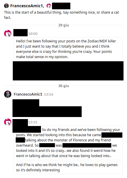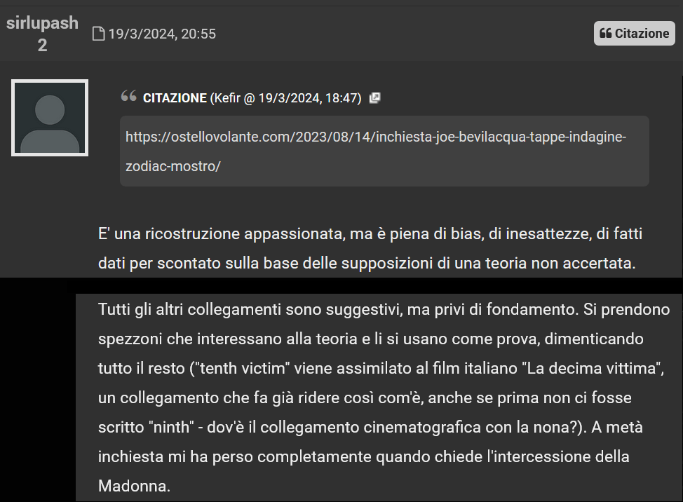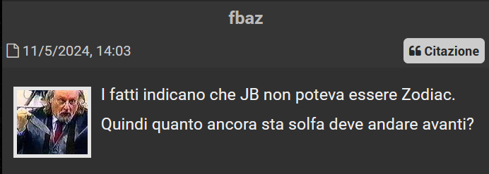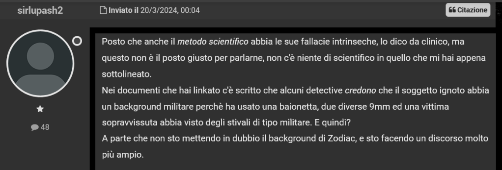 Inizio da un commento di Psycothic, storico amministratore del forum I mostri di Firenze, che alla fine di marzo 2024 ha decretato la “censura” della discussone “Zodiac-Mostro”, sollecitato da alcuni utenti. Fra i più attivi promotori di ban anti-Zodiac dal 2018 a oggi troviamo tarefomen e total_disgrace.
