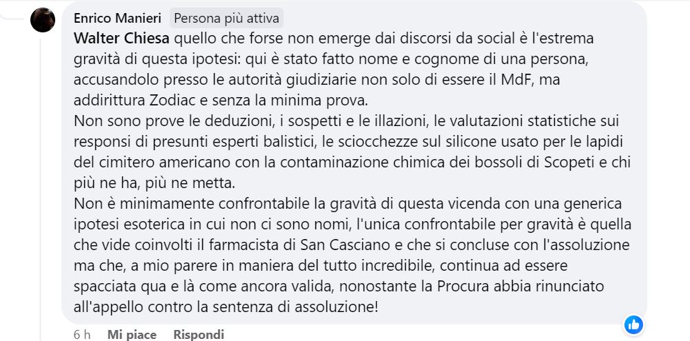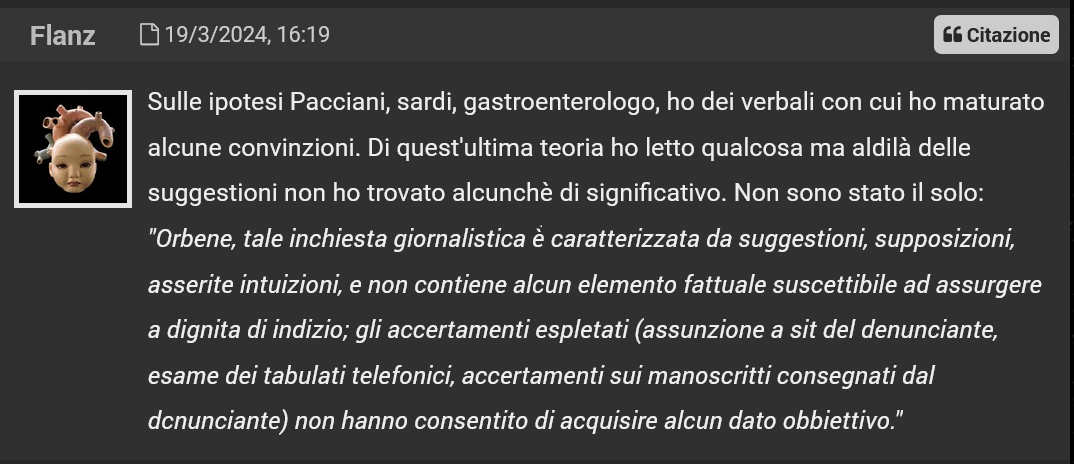 L’amministratore del gruppo, Flanz-Cappelletti nella realtà quotidiana non virtuale è addetto di un reparto commerciale di una casa editrice. Anni fa si è interessato alla vicenda e ha deciso di fare un sito, Insufficienza di Prove, dove ha trascritto gran parte delle testimonianze dei processi del caso Mostro, disponibili in audio su Radio Radicale. Ha anche collaborato alla redazione di due libri. Io stesso l’ho intervistato nel 2018.