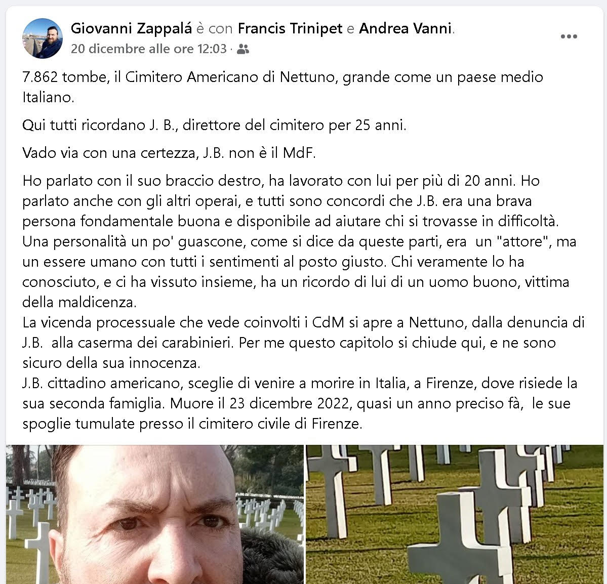 L’87enne italo-americano – 20 anni di carriera militare alle spalle, un turno in Vietnam, prima di approdare all’ABMC e andare in pensione nel 2010 – è morto nel dicembre dello stesso anno, quattro anni e mezzo dopo essere stato da me denunciato. Senza mai essere sentito da un magistrato di Firenze mentre era indagato e “parte offesa”.