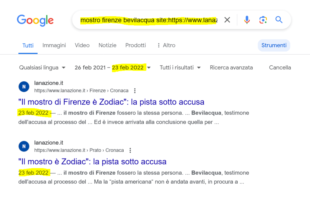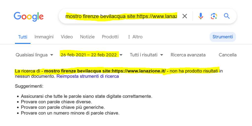 La Nazione ha dato la notizia dell’archiviazione del caso Bevilacqua il 23 febbraio 2022, su segnalazione del sottoscritto che ne aveva da poco scoperta l’esistenza nel suo fascicolo per diffamazione. La notizia non era mai uscita prima.