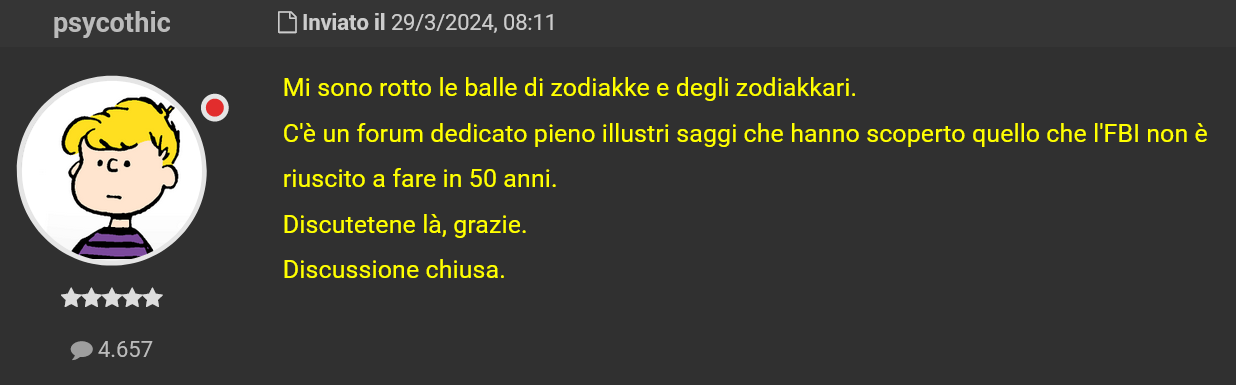 Va dato atto che “Psyco” abbia ospitato e lasciato discutere per anni sul suo forum quelli che qui definisce “zodiakkari”.