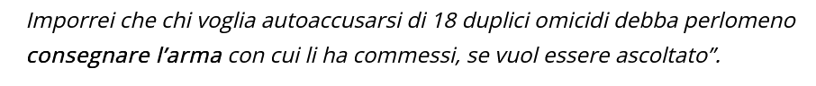 Posto che gli omicidi attribuiti al Mostro comprensivi di Signa sarebbero 16 e che Bevilacqua non aveva intenzione di costituirsi nel giugno 2018, è una rarità che le prove intese come “corpi di reato”, ad esempio la pistola del Mostro, vengano consegnate volontariamente dai colpevoli.