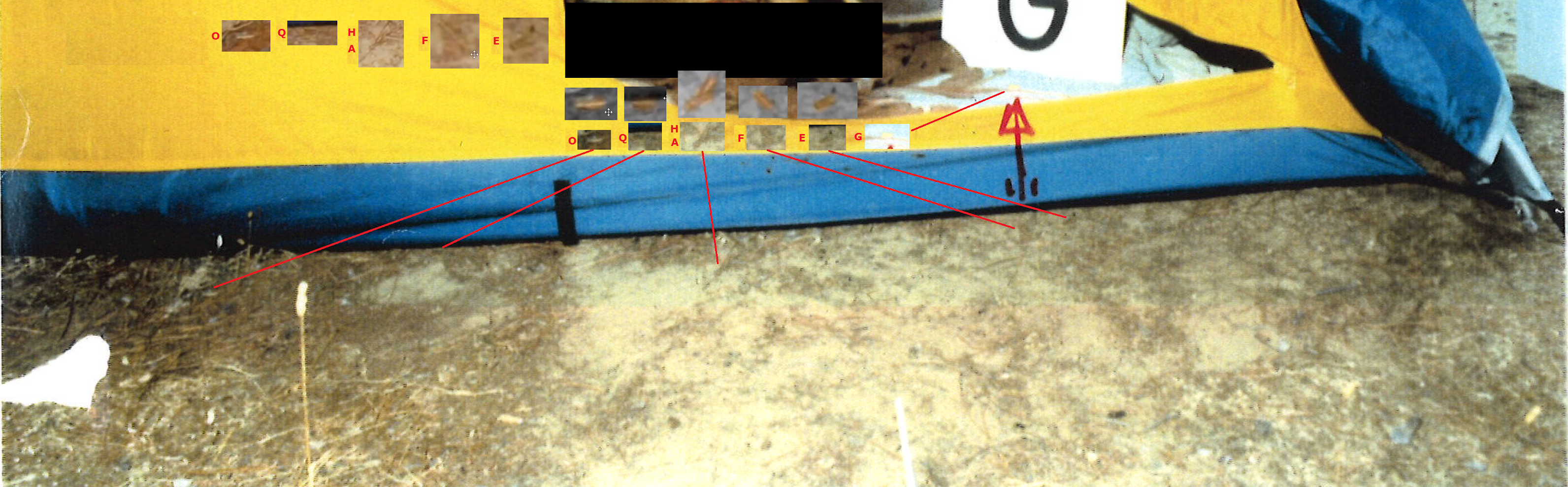 In basso, pubblico una foto agli atti elaborata dal blogger Antonio Segnini che mostra la possibile collocazione dei bossoli indicata da Manieri prima che fossero visti dalla polizia. Nessuna traccia visiva di supposti “inquinanti” chimici. Inoltre, il bossolo G si trovava nella tenda. Perché aveva il cratere del percussore contaminato allo stesso modo dei bossoli all’esterno?