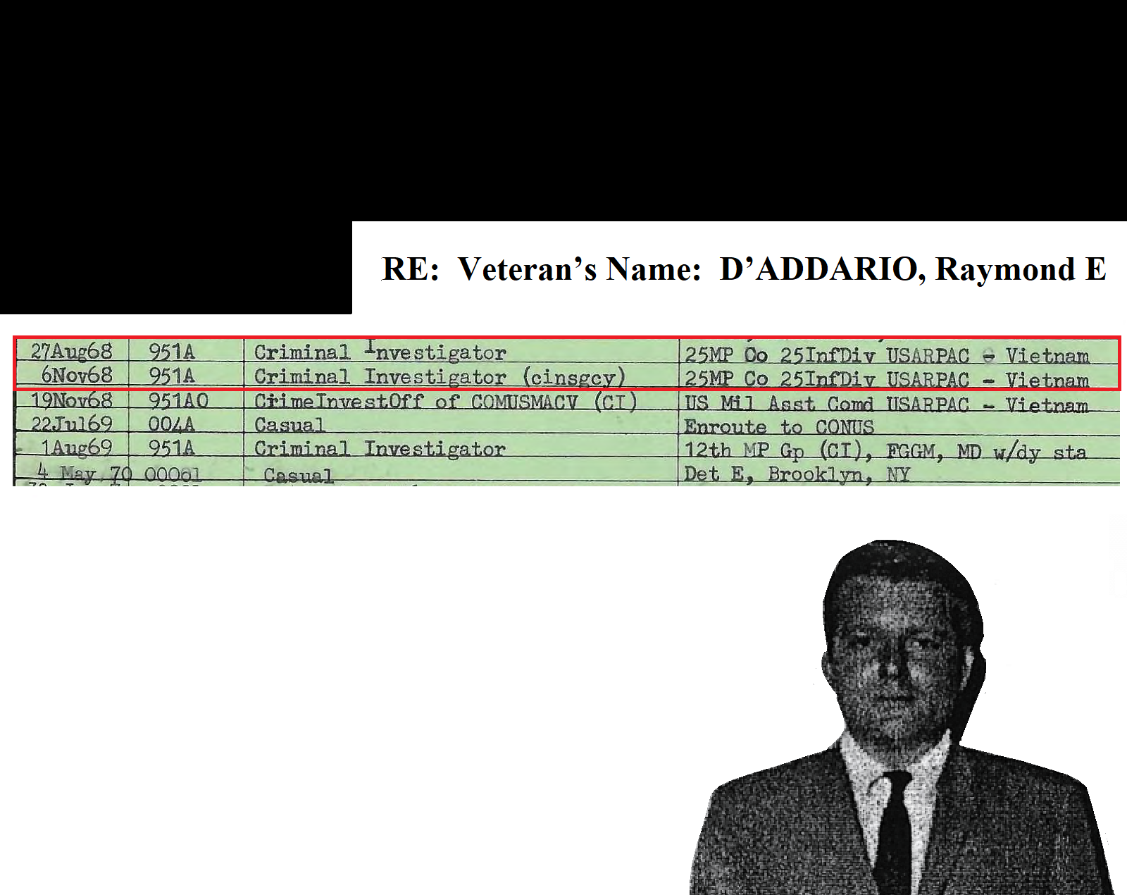 A response to my FOIA request proves that D’Addario was an investigator for the CID unit in the 25th Division of which Bevilacqua was part between August and November ’68.