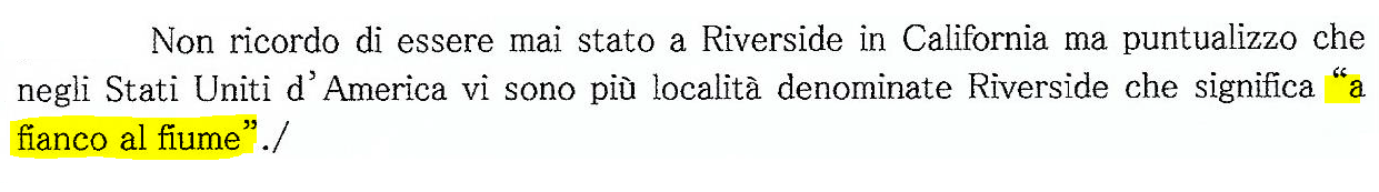 "I don't remember ever being in Riverside in California but I point out that in the US there are several places called Riverside which means 'by the river'".