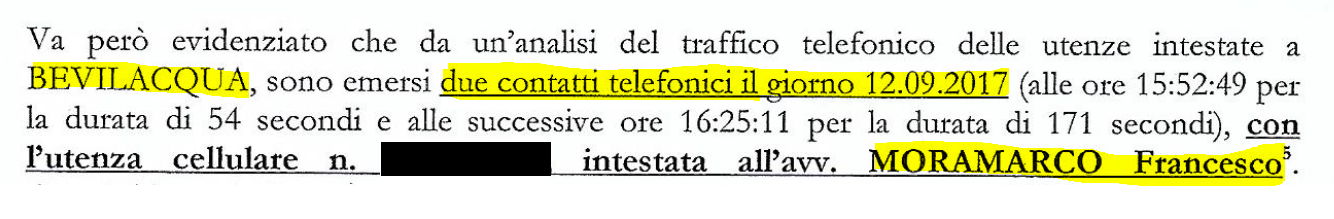 Mezz’ora dopo una prima breve telefonata, Moramarco ha ricontattato Bevilacqua, non prima di aver avuto uno scambio di messaggi con il sottoscritto, come mette in luce la perizia di parte sui tabulati depositata nel mio processo per diffamazione.