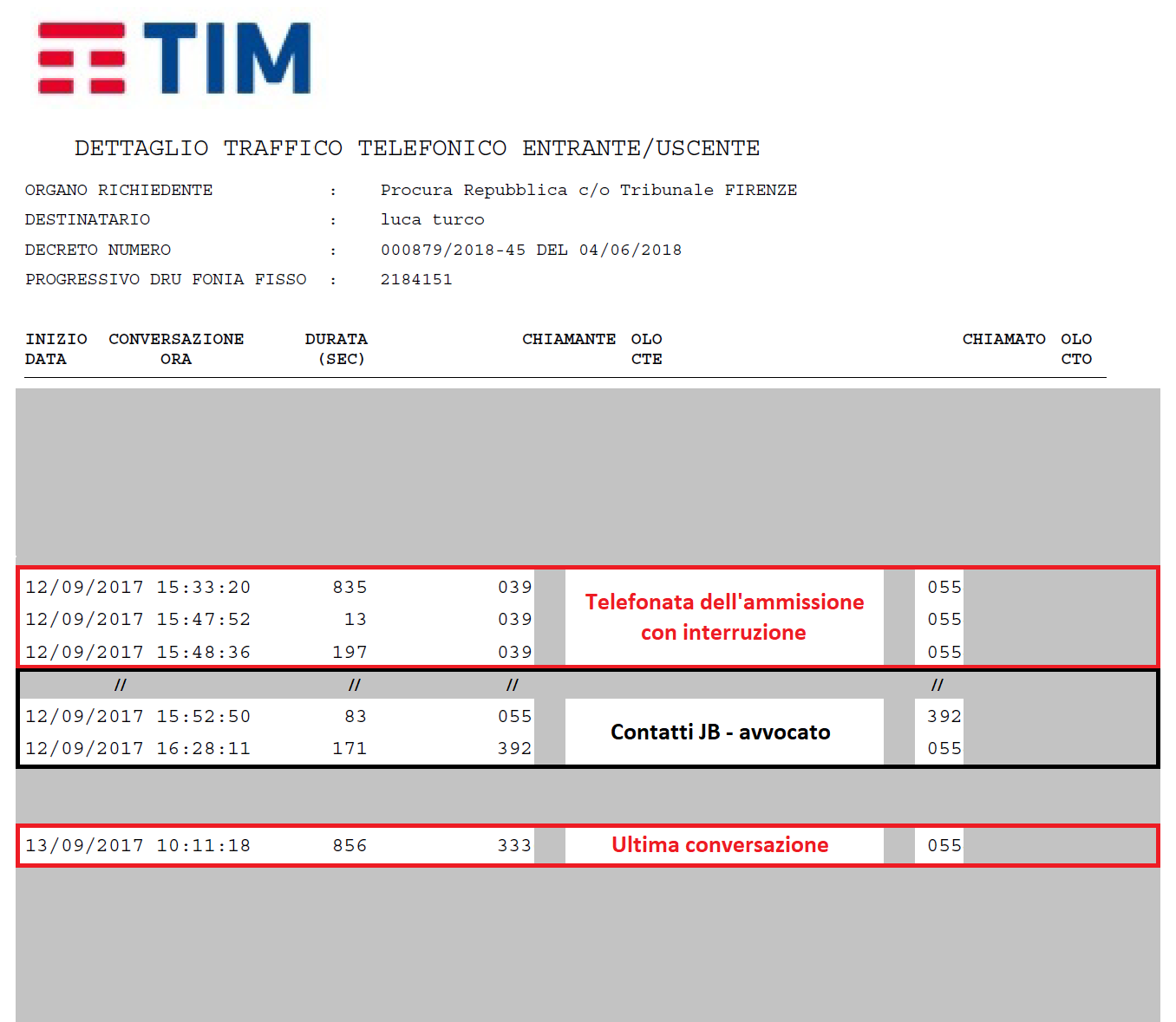 - Nella loro analisi dei tabulati, ai Carabinieri sfugge la “telefonata dell’ammissione”, facilmente riscontrabile nei dati grezzi a loro disposizione.