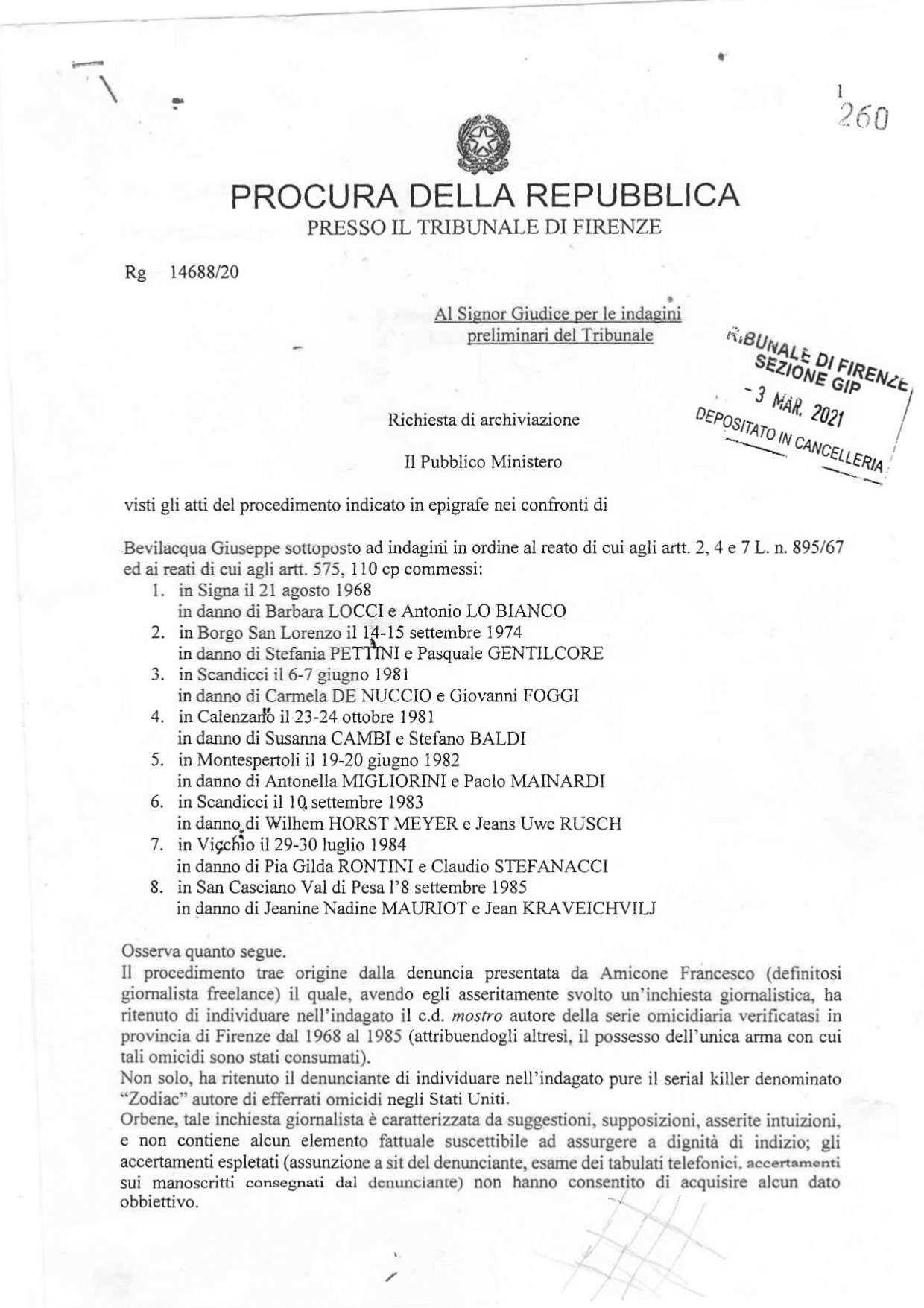 - Al 2023, la Procura non รจ in grado di rintracciare il verbale di sommarie informazioni testimoniali di Bevilacqua del ’92 che dovrebbe essere agli atti del processo Pacciani. Un atto che conferma le sue contraddizioni e potrebbe celare altri indizi.