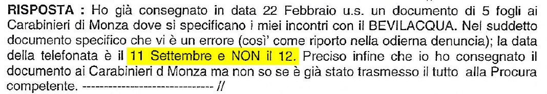Uso il condizionale perchรฉ i due ufficiali della pg mi attribuiscono per sbaglio un’informazione falsa che Bevilacqua dร ai Carabinieri il giorno successivo. Informazione ribadita successivamente nella sua querela (immagini in basso).