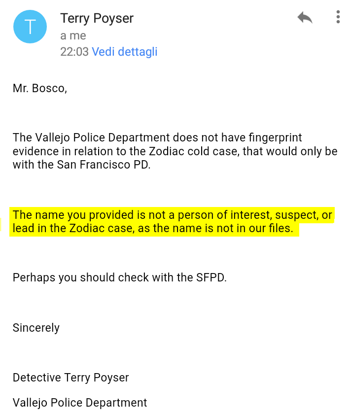 "...non è una persona d'interesse, un sospettato, o una pista nel caso Zodiac, in quanto il suo nome non è nei nostri archivi."
