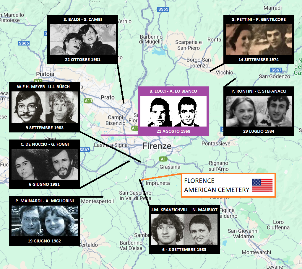 In basso, gli omicidi del Mostro di Firenze nelle vicinanze del Cimitero Americano. L’area dove sono stati commessi, in campagna, ai margini dei centri abitati, contava poche migliaia di residenti.