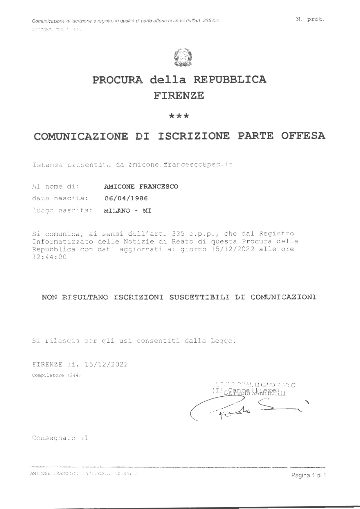 Più di un anno dopo, a pochi giorni dalla morte di Bevilacqua nel dicembre 2022, non risulterà essere mai stato aperto un procedimento penale sulla base di questa denuncia, stando alla verifica dei cancellieri della Procura di Firenze del database delle notizie di reato (documento in basso).