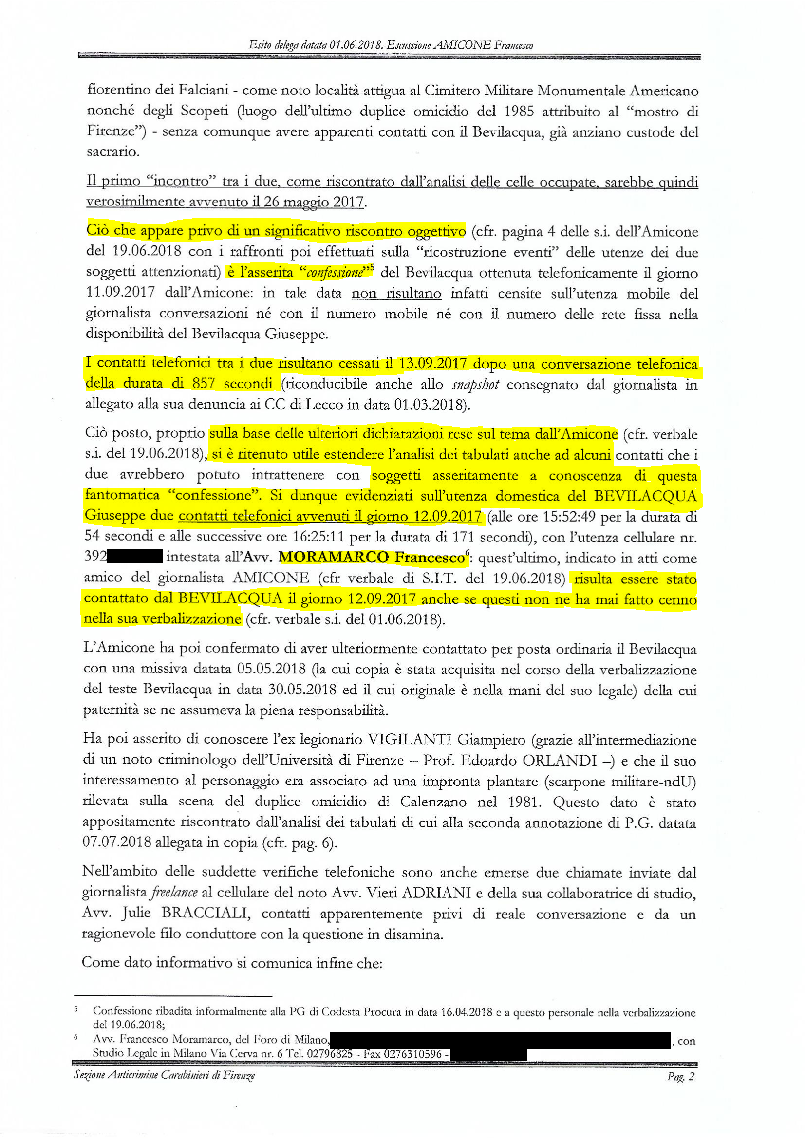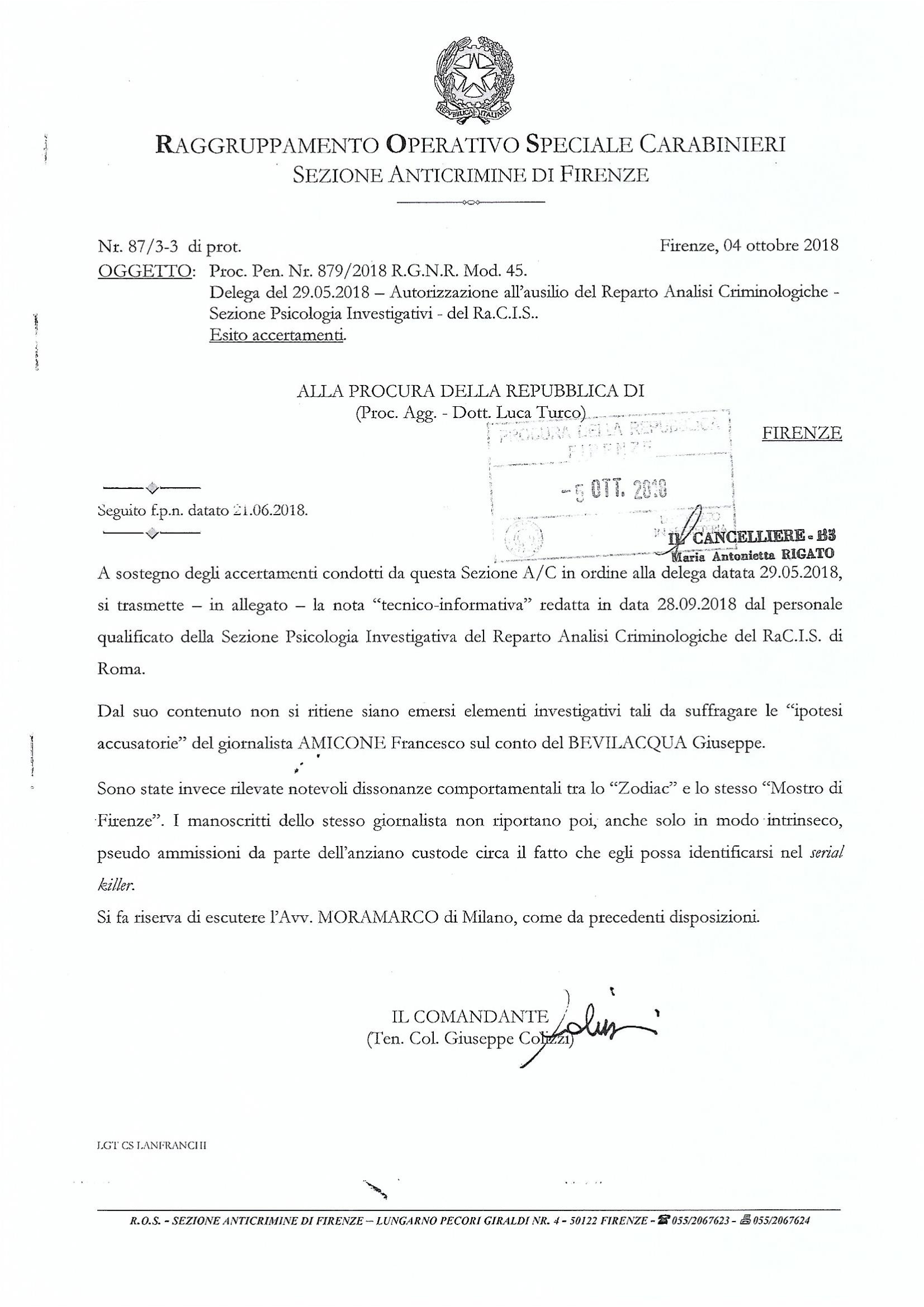 Il profilo genetico viene condiviso con la Procura di Firenze, che non lo ha mai acquisito prima stante la decisione di sentire Bevilacqua a casa sua, insieme ai familiari (nota del comandante Colizzi del 1 giugno 2018).