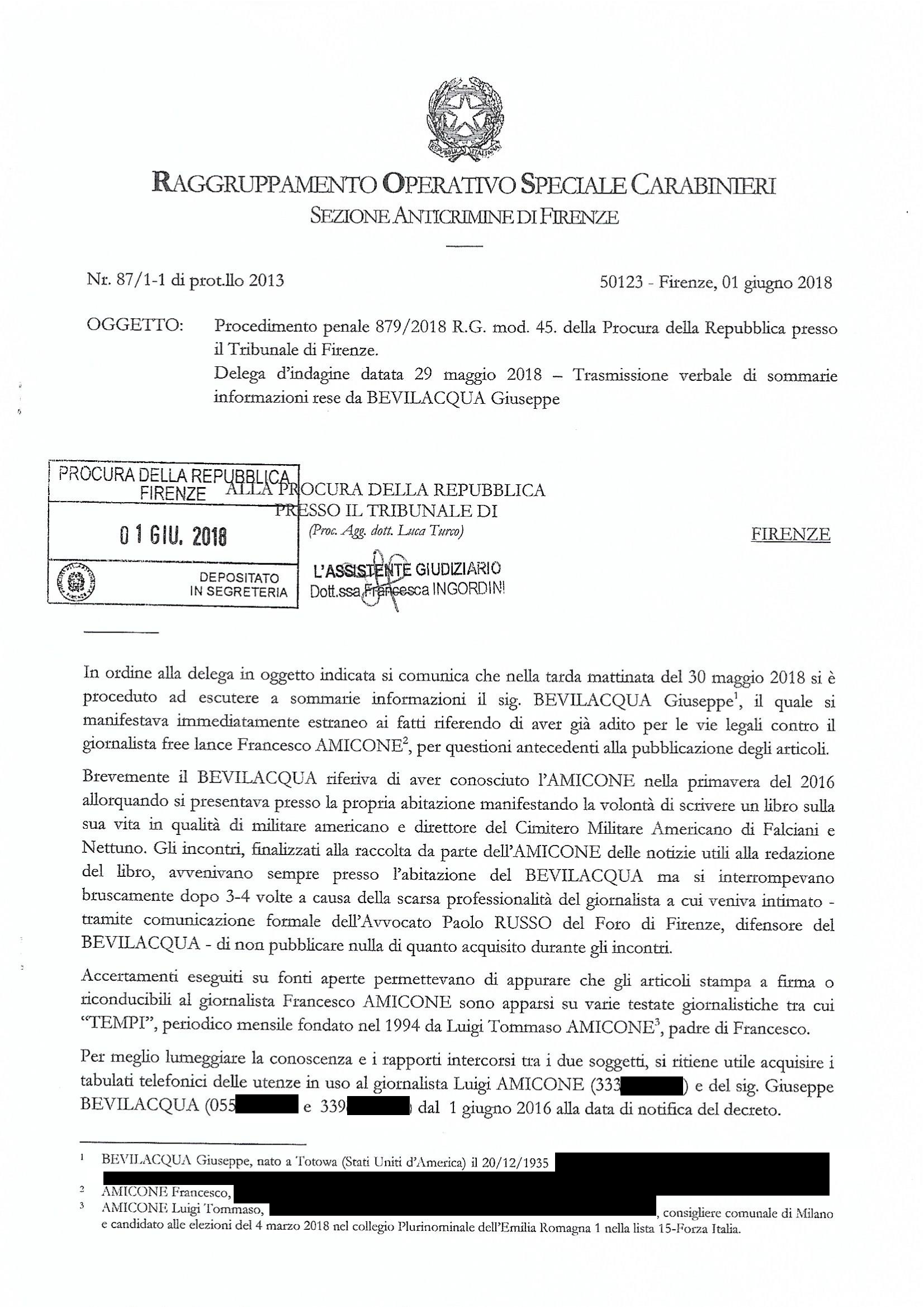 2 giugno 2018, in violazione del segreto d’ufficio la Procura di Firenze comunica alla Nazione che la mia denuncia è una pista morta. In tal modo, Bevilacqua può facilmente dedurre l’assenza di una registrazione della sua ammissione.