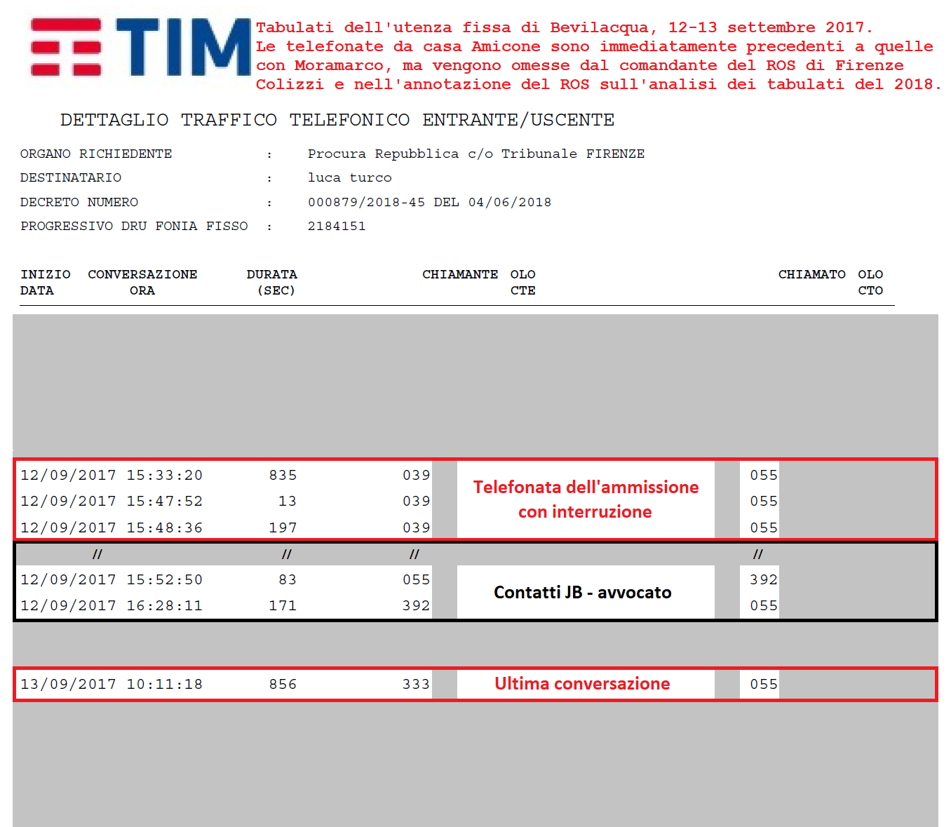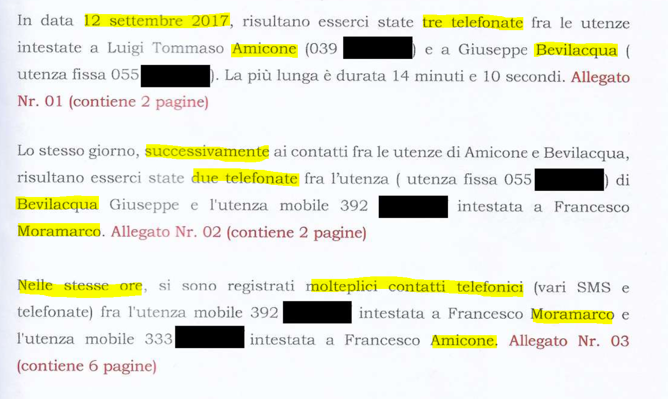 Per motivi a me ignoti, l’autore dell’analisi e il col. Colizzi non citano le tre nostre telefonate consecutive del 12 settembre effettuate dalle nostre utenze fisse che precedono quelle fra Bevilacqua e l’avv. Moramarco (verranno accertate anche da una relazione tecnica difensiva). Questa mancata citazione verrà usata per motivare la mia condanna del 2024 dalla giudice Serafina Cannatà, che trascurerà la relazione tecnica difensiva e i tabulati completi allegati.