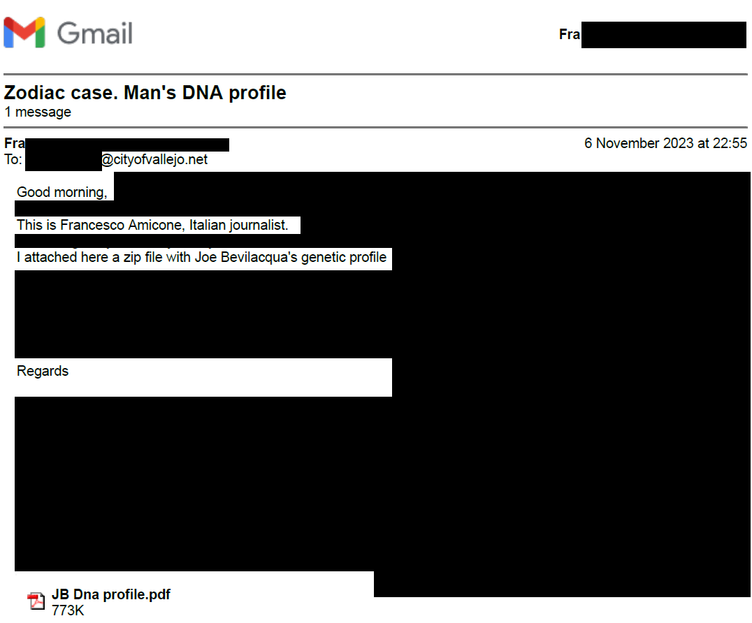 Ci sono anche altri documenti rilevanti fino alla trasmissione da parte mia del profilo genetico di Bevilacqua alle forze dell’ordine statunitensi che hanno giurisdizione sugli omicidi di Zodiac nel novembre 2023. Ho ottenuto il profilo a scopo difensivo dal sostituto procuratore Nicola Marini, Procura di Siena, che aveva fatto acquisire il DNA nel 2020. Nonostante la sollecitazione dei miei avvocati nel marzo 2022, la Procura di Firenze ha deciso di non inviare il profilo genetico di Bevilacqua negli Stati Uniti alle autorità competenti sul caso Zodiac.