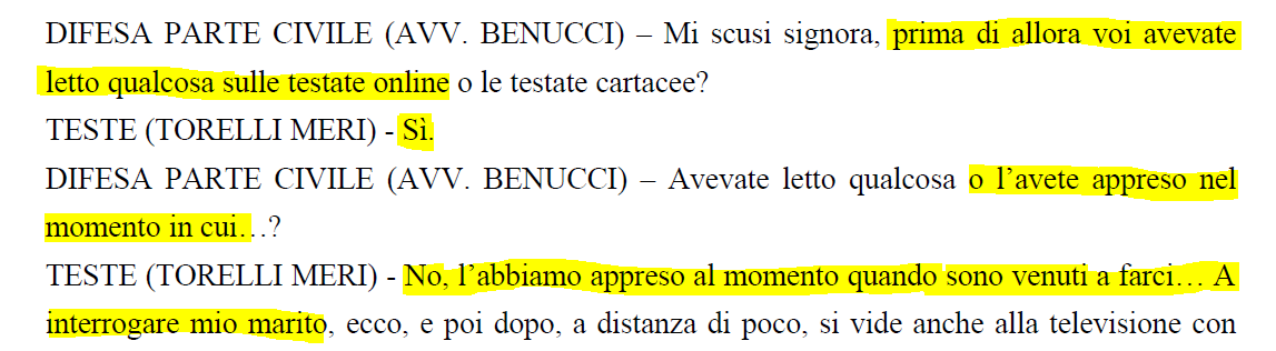 La signora Torelli ribadirà questa versione nella sua deposizione contraddittoria del 12 ottobre 2023 al mio processo (trascrizione in basso).
