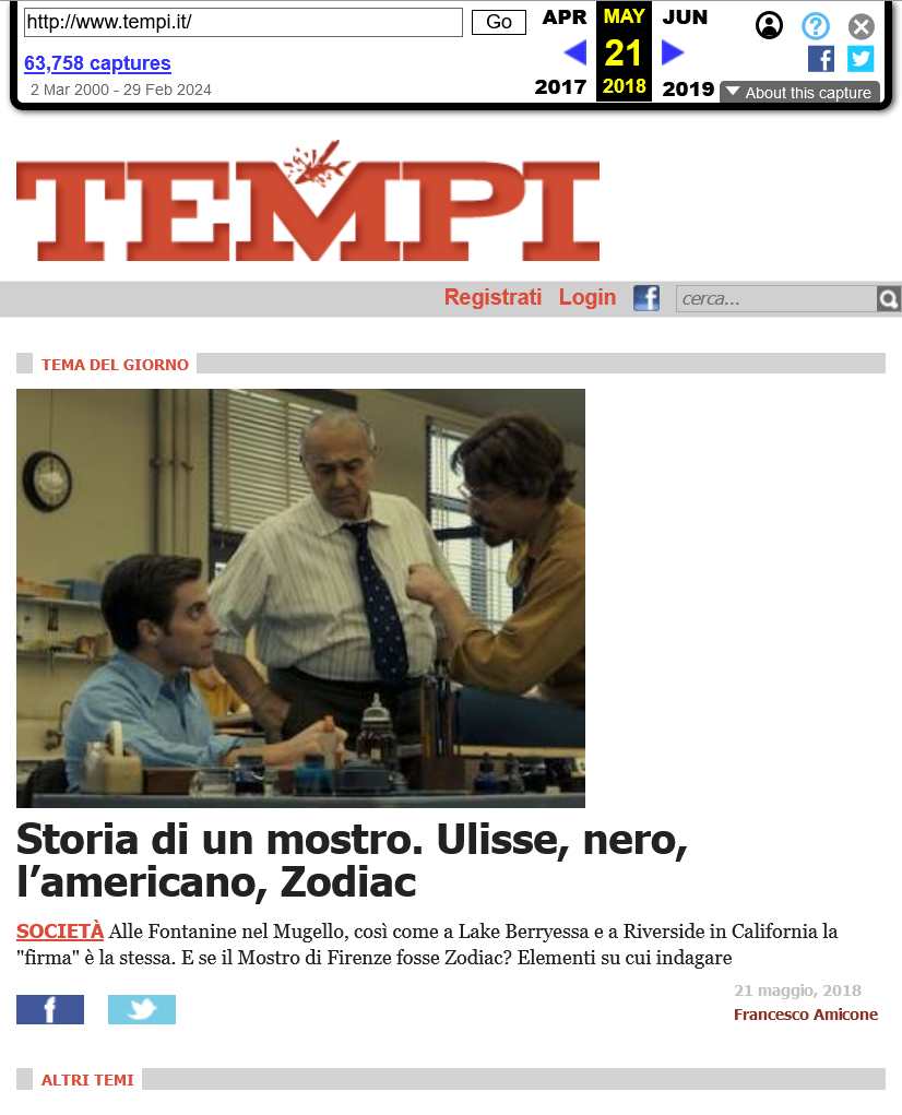 17 – 19 maggio, viene pubblicata la mia inchiesta sulla connessione Zodiac-Mostro su tempi.it. Il 21 maggio, l’articolo integrale che cita Bevilacqua con il nomignolo “Ulisse”, in riferimento al colloquio fra Mario Vanni e Lorenzo Nesi, è ben in vista sulla homepage del sito.