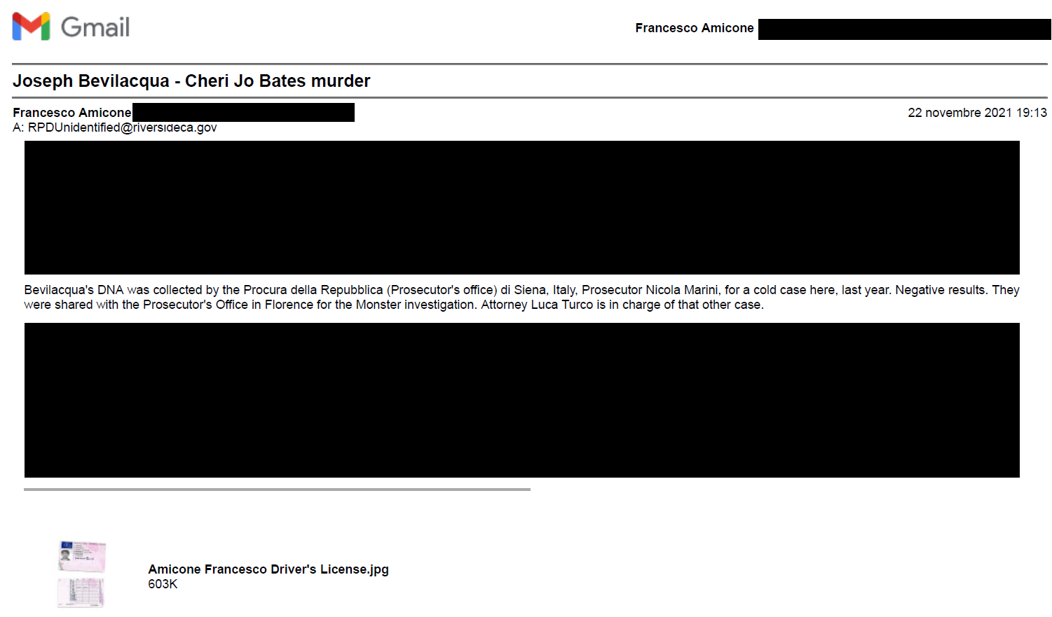 In fondo, ci sono le email del novembre 2023 alle forze dell’ordine statunitensi con allegato il profilo genetico di Bevilacqua ottenuto per indagini difensive dal sostituto procuratore Nicola Marini, Procura di Siena, che ha acquisito il DNA dell’italo-americano nel 2020.
