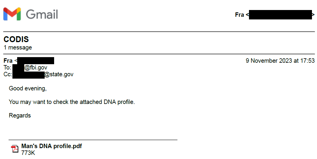 Novembre 2023, trasmissione del profilo del DNA alle autorità USA (prossime immagini)