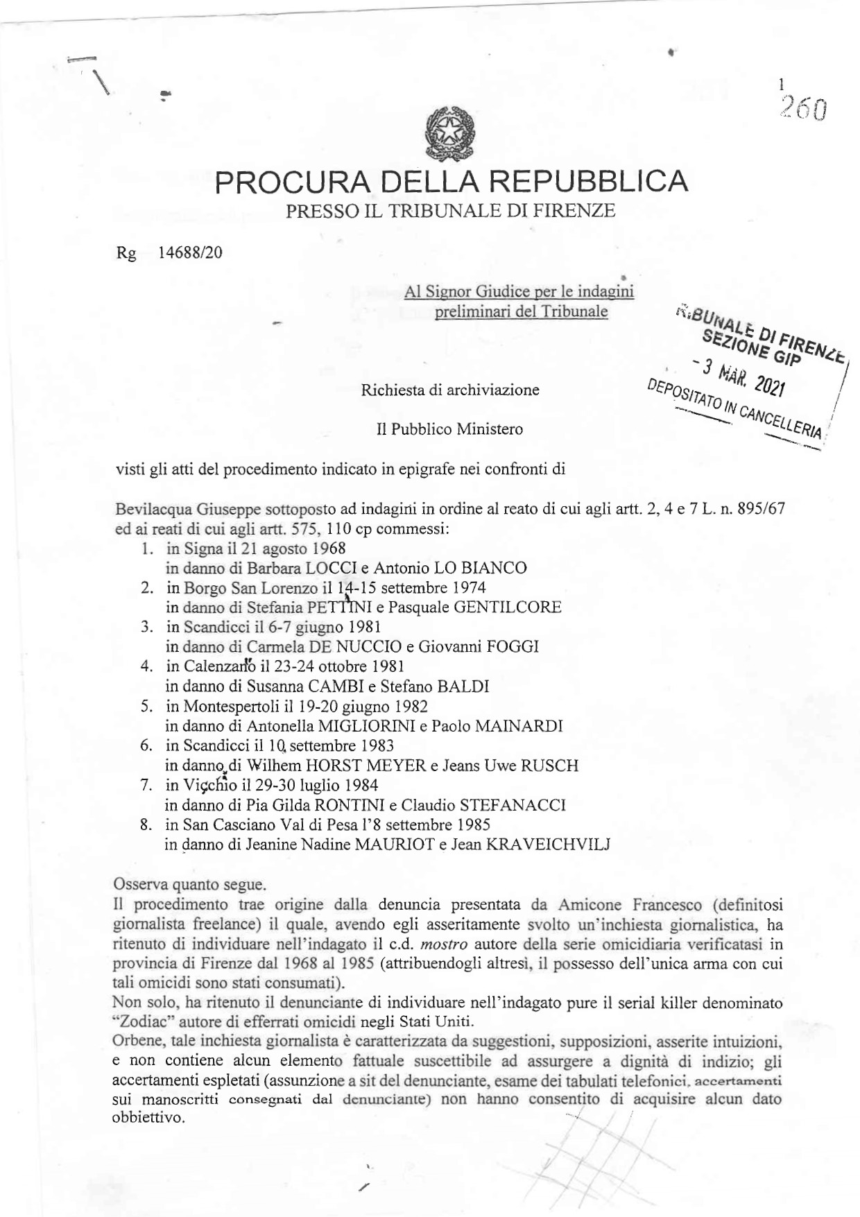 - 2018, March 1 – Denunciation against Bevilacqua regarding the Monster of Florence murders